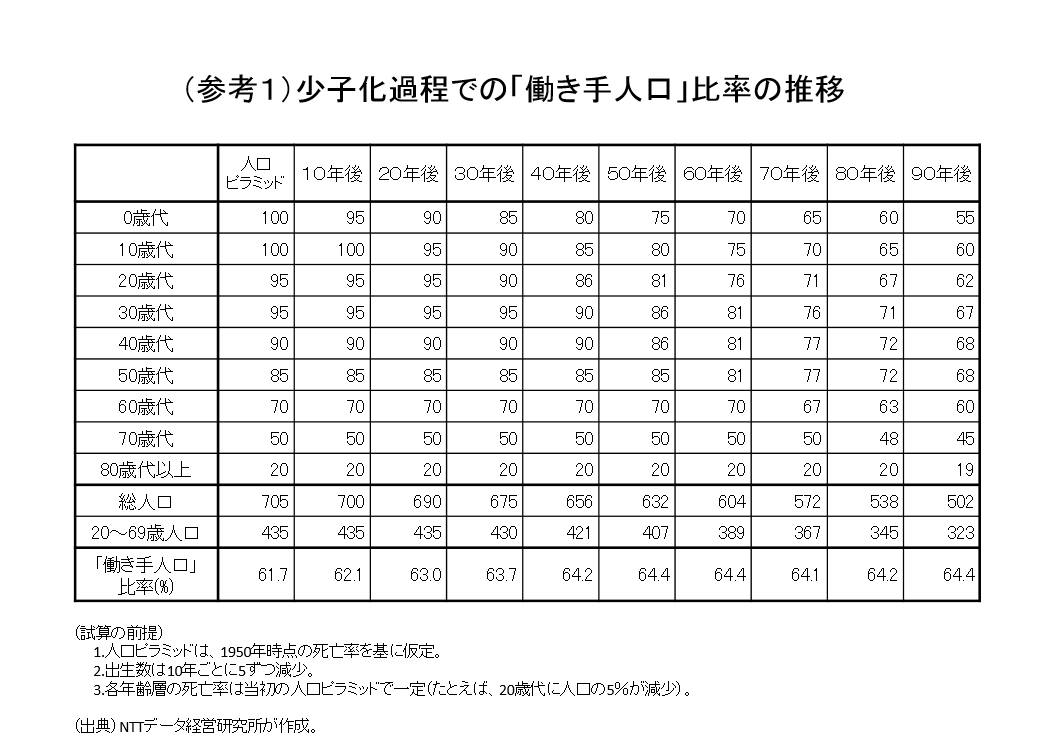 確認のため、参考1に「長寿化」の要素を付け加えてみよう。参考2は、各年齢層の死亡率が毎期5%ずつ低下すると仮定して、「働き手人口」比率の推移をみたものだ。