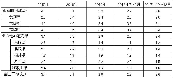 最新2017年10~12月のデータによれば、完全失業率は島根、鳥取、福井の3県が全国最低の1%台前半となった。これに岩手、和歌山の両県が続く(参考参照)。いずれも超人手不足状態にあるといってよい。
