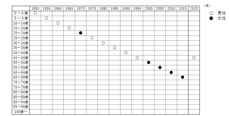 (参考1)日本の人口の最大勢力推移(年齢5歳階級別、1950~2020年)