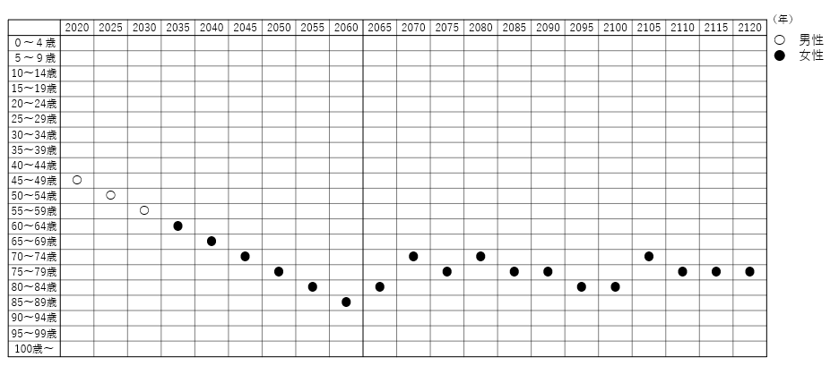 団塊ジュニアが90歳前後に至り最大勢力の座を降りたとき、その後長期にわたりその座を引き継ぐ世代は存在しない。色々な世代が入れ替わり立ち代わり、最大勢力を引き継いでいくことになる。