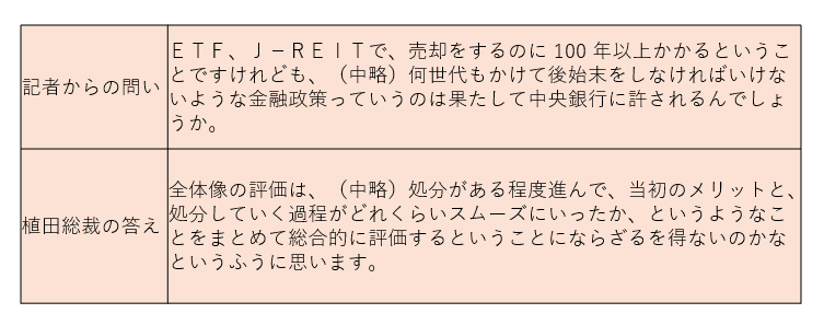 9月の金融政策決定会合後の記者会見で、日銀の植田和男総裁はETF買い入れの評価を尋ねられ、次のように答えている(参考3)。