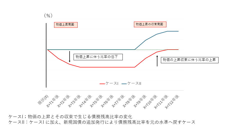 逆に、物価上昇が収束する局面では、債務残高比率は上昇し、これがしばらく続く。分母の伸び率低下が分子の伸び率鈍化に先行するからだ。以上をイメージとして図示したのが参考3のケースIである。