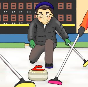自分がストーンを投げる番となり、左足のカバーを外して格好よく投げようとするものの、態勢を崩し、あわてて投げる。すると、ストーンは的(ハウス)を大きく越え、無効のエリアに行ってしまう。